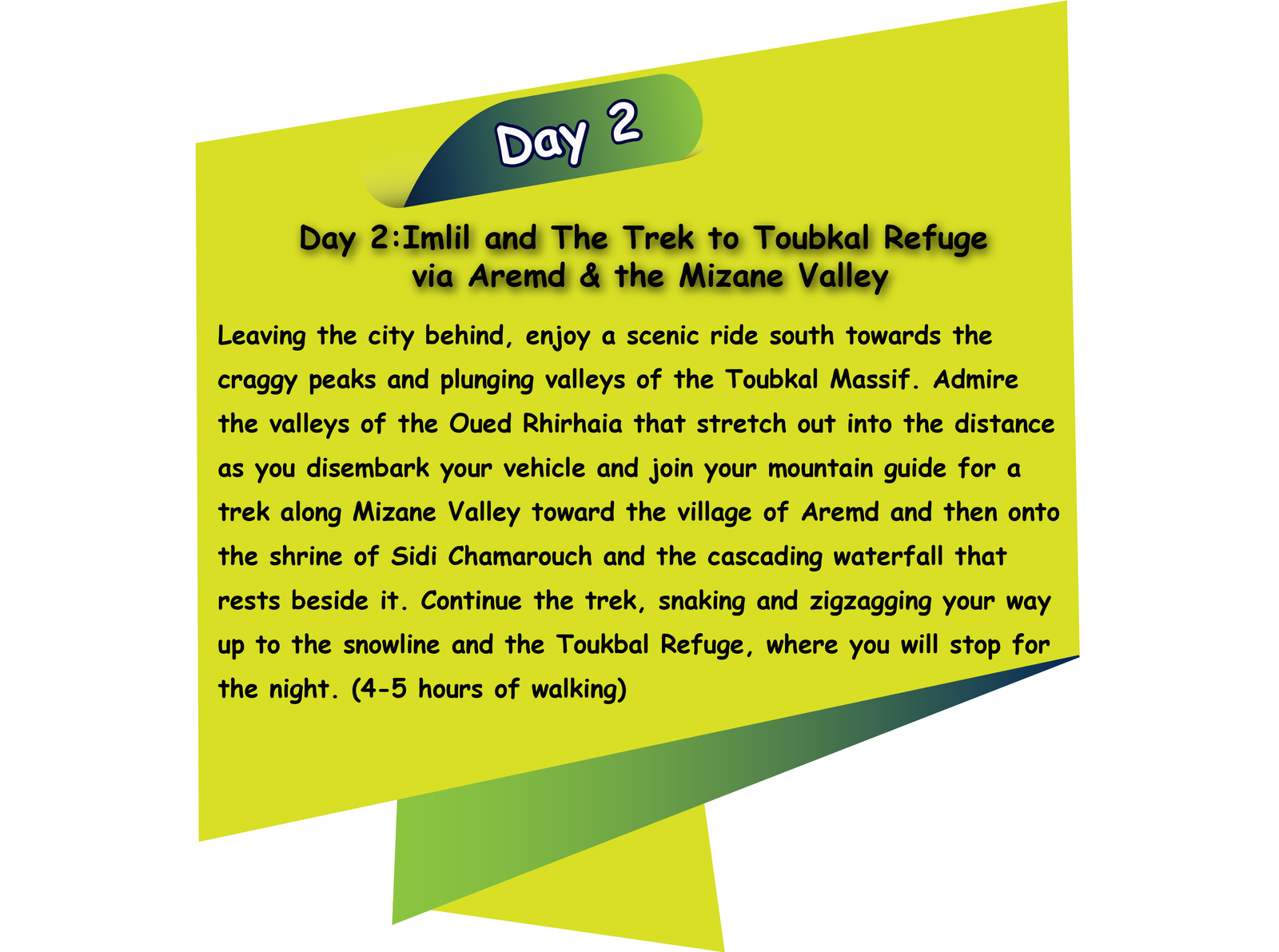 • Tour Imlil and begin the trek to Toubkal Refuge via Aremd and the
