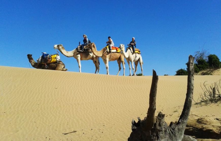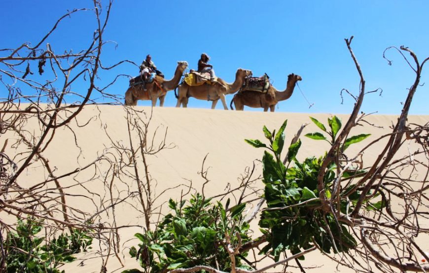 Take a moment to relax and explore nature with this dromedary tour experience. The dromedary rides are ideal for groups or families with small children. During this tour, discover the surroundings of the Ranch de Diabat in peace. Just a few minutes from Essaouira, the ride begins at the Ranch de Diabat. Continue on to the dunes, where the former home of the Black Sultan is hidden. You can roam the long beaches, overlooking the Portuguese castle on the island of Mogador. You will climb the dunes and pass by fishermen’s cottages near a freshwater spring, where the animals can refresh. The route back to the Ranch de Diabat takes you along a small path through the heart of the forest. The dromedary is a quiet and friendly animal that will allow you to enjoy this tour with family or friends.