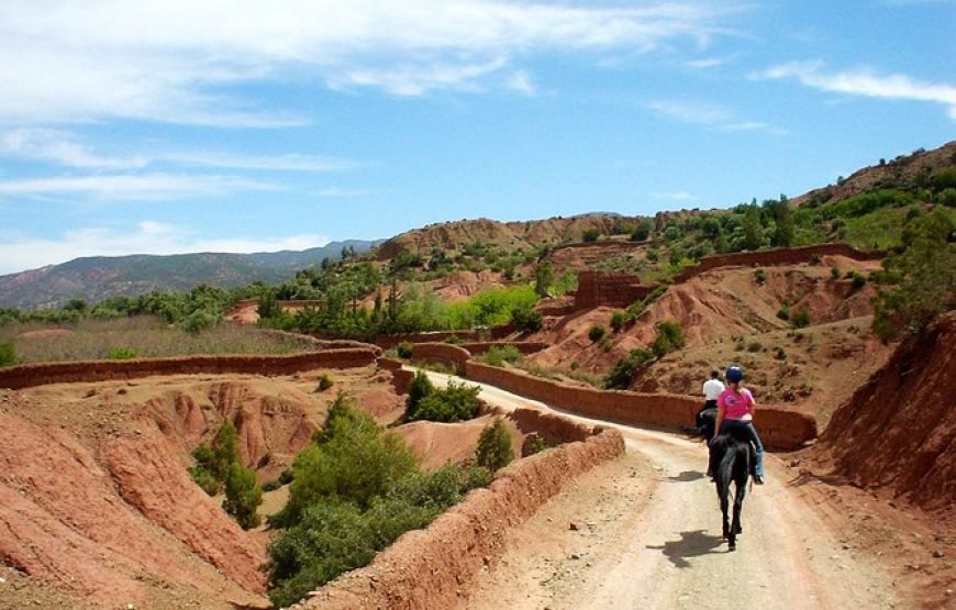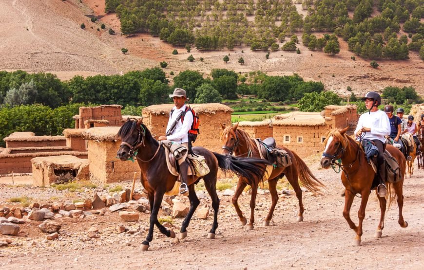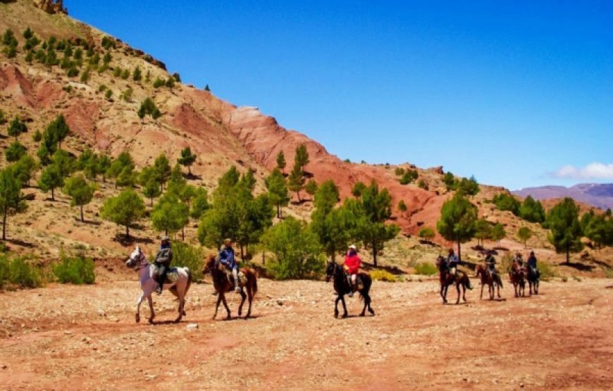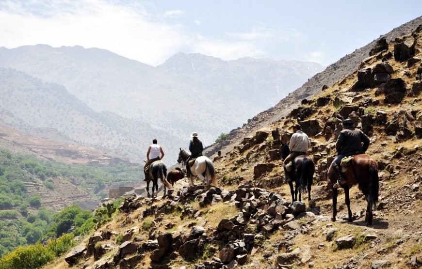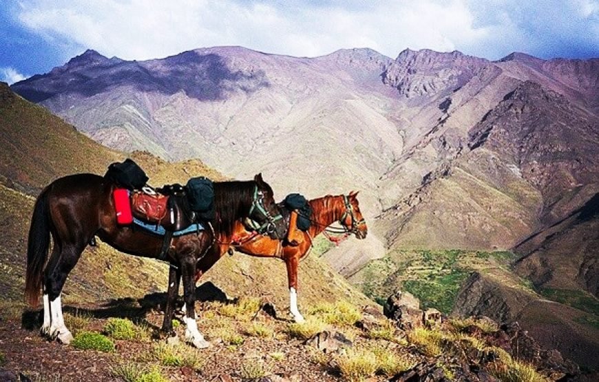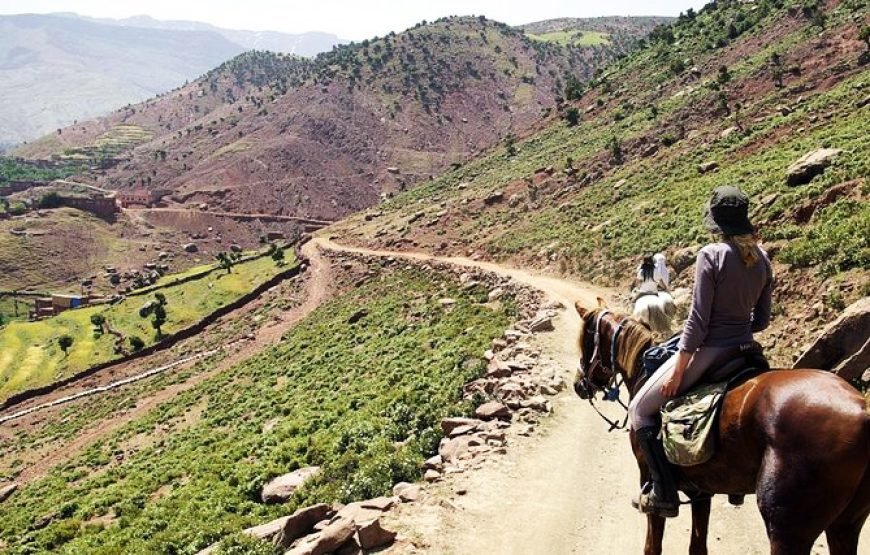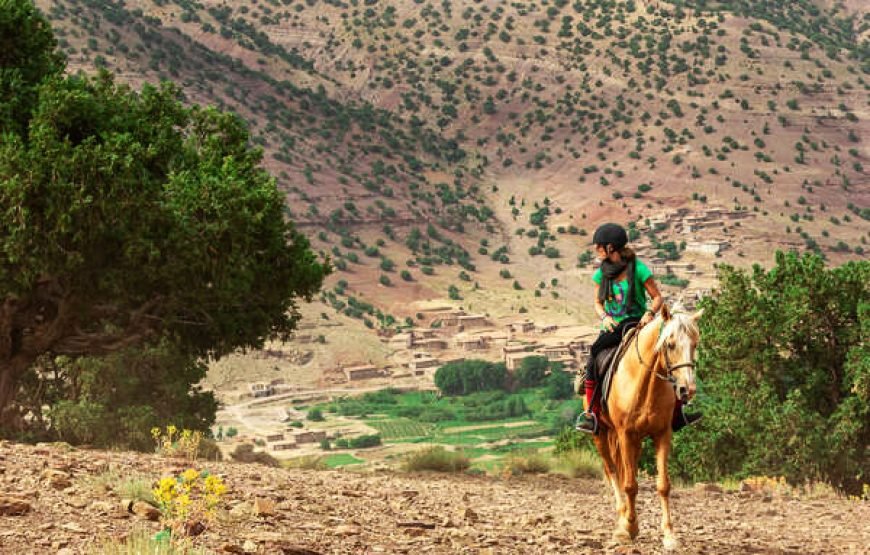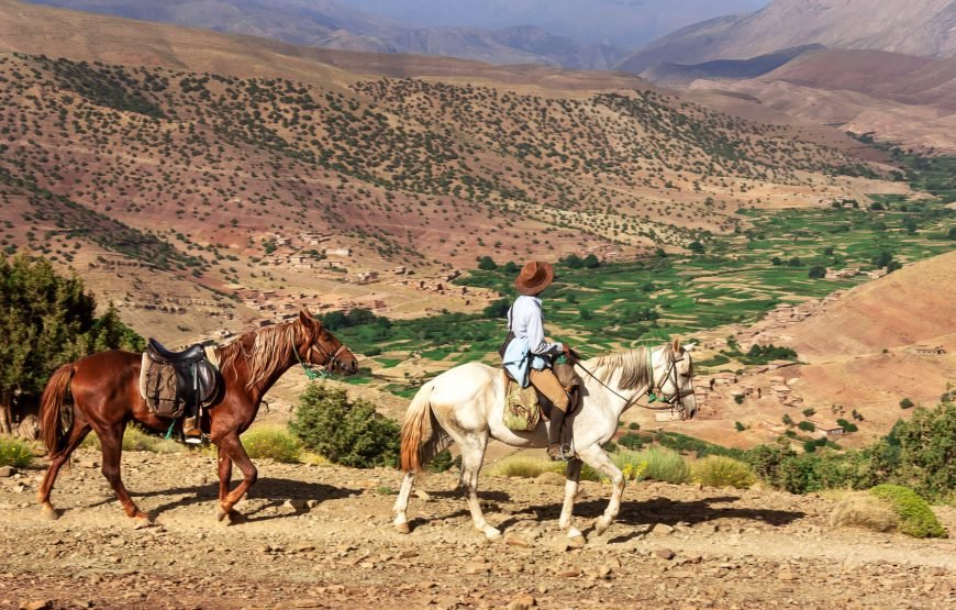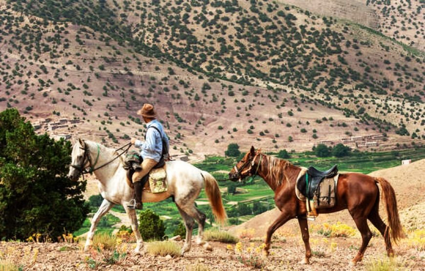 After morning pickup from your accommodation in Marrakech, set off on a roughly 1-hour long drive into the High Atlas Mountains, bound for the mountain town of Tahnaout. Arriving, you’ll be paired with a horse and provided with all the necessary equipment to set off on a journey through stunning mountain trails. Your guide will lead you through towering juniper forests, steadily through the foothills of the mountain range, up to scenic viewpoints over the Asni Valley and sprawling Al Haouz plains. Ride on to Rha Moulay Brahim, where you’ll drop off your horse. Continue on, via car, to Imlil for a sumptuous local lunch with a view of the highest peaks of the High Atlas Mountains. After lunch, you’ll head back down the mountain to your accommodation in Marrakech.