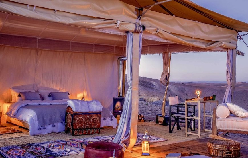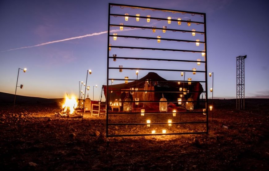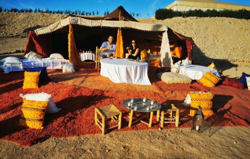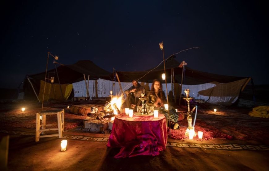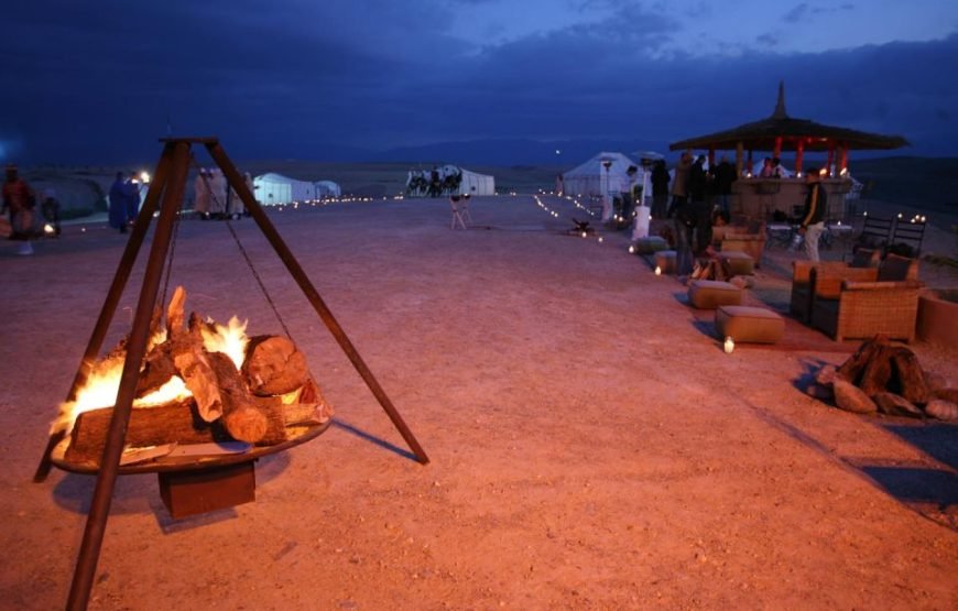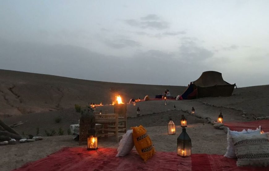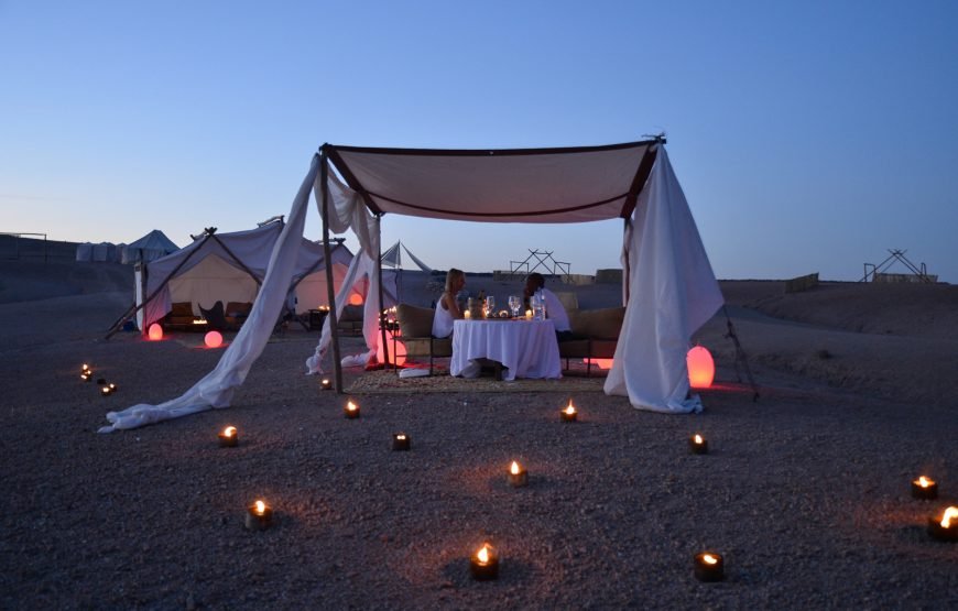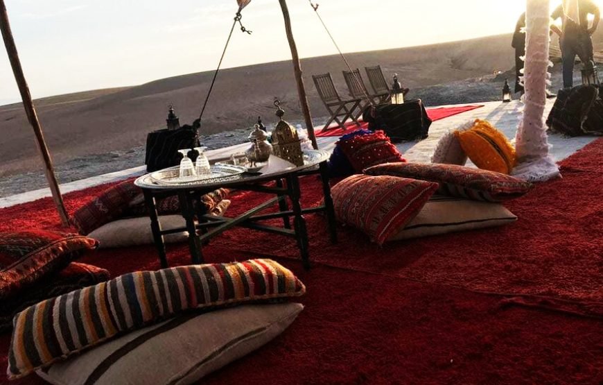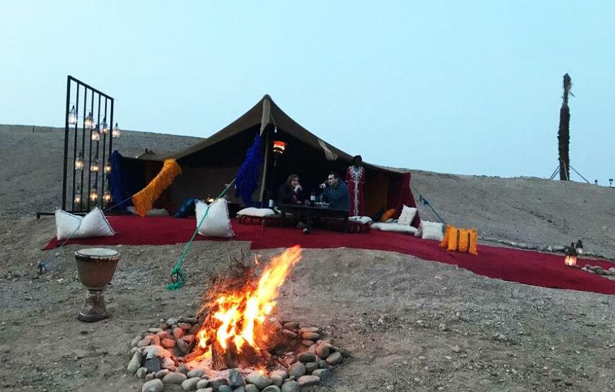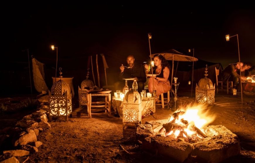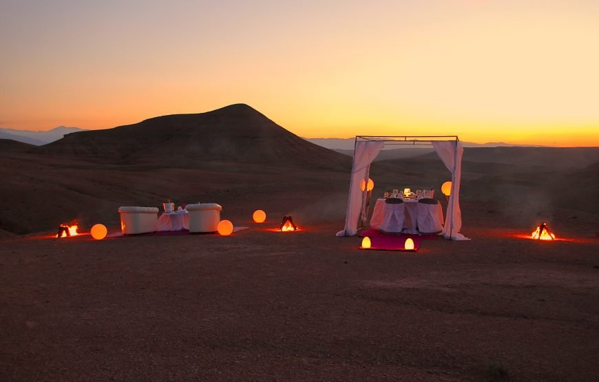 At 5:00 pm you will be picked up from your hotel in a private car and driven towards Agafay Desert Camp for a unique dining experience. Watch the sunset over the desert and enjoy true Arabian hospitality. Experience traditional Moroccan cuisine under a starry sky. Dine in a Bedouin tent around a campfire. Hear the unforgettable sound of the desert silence.