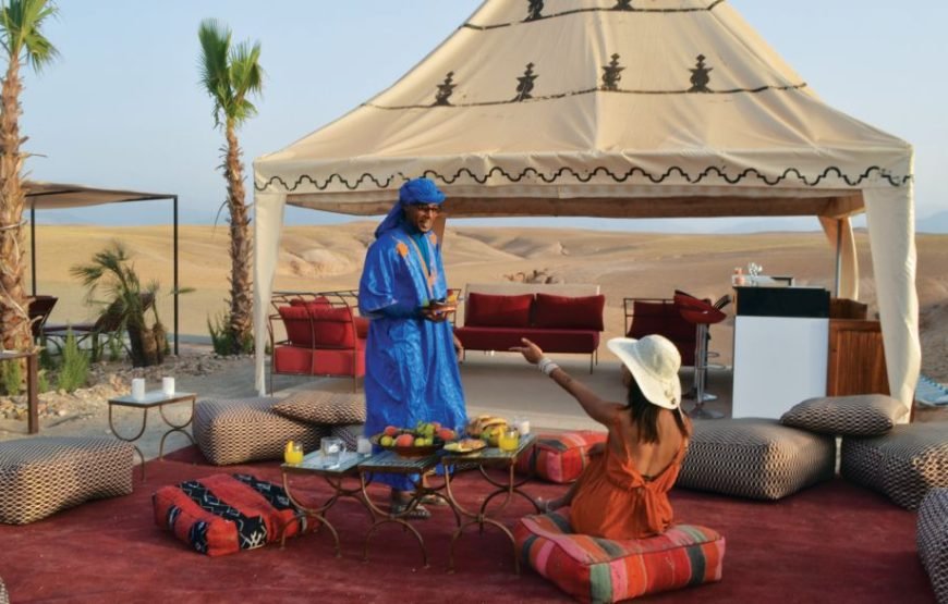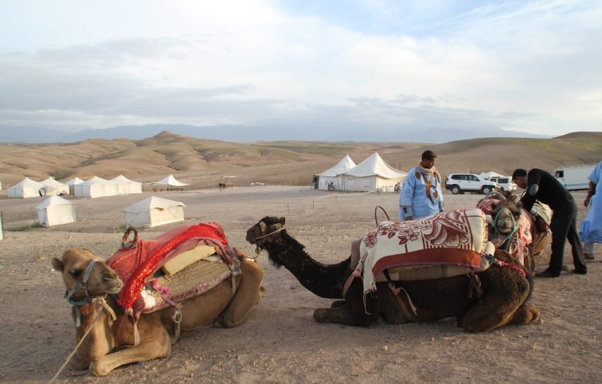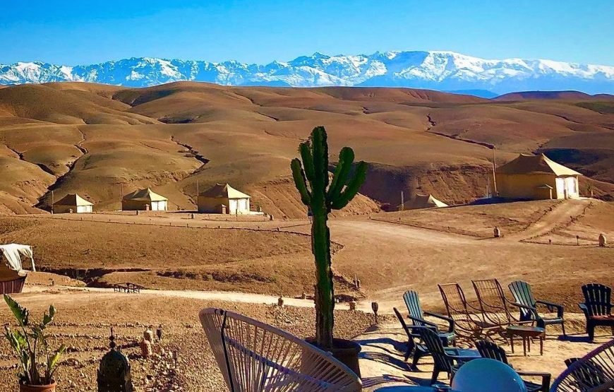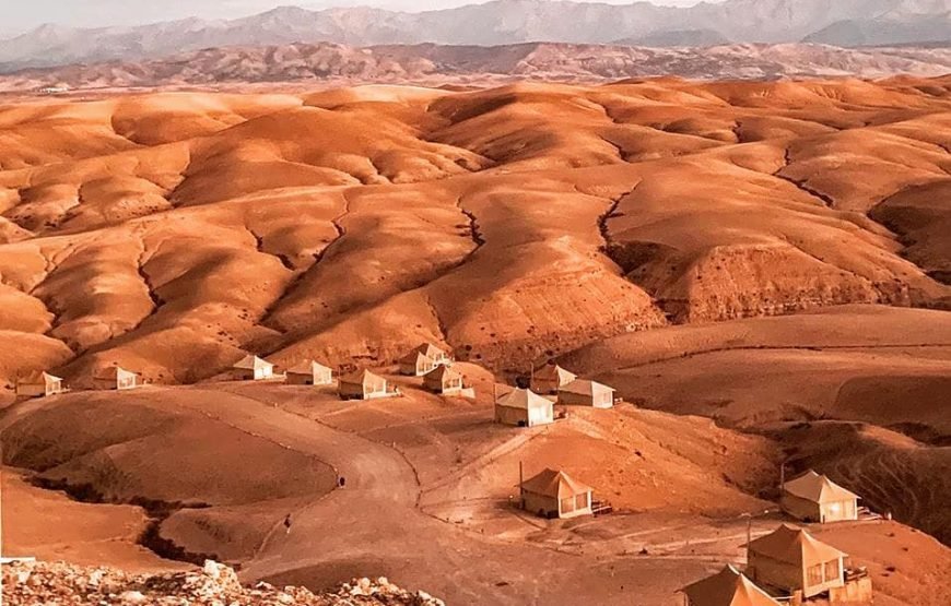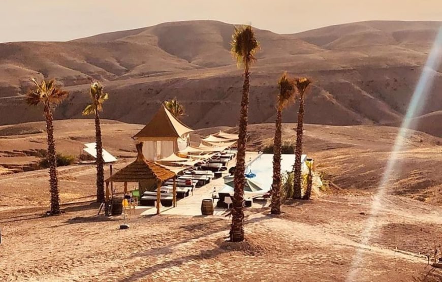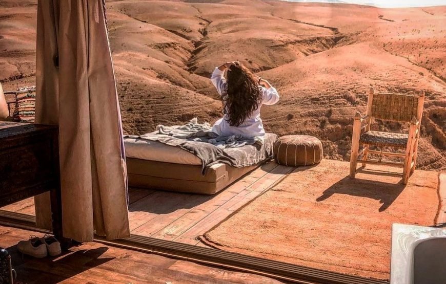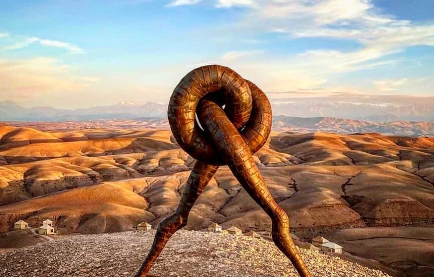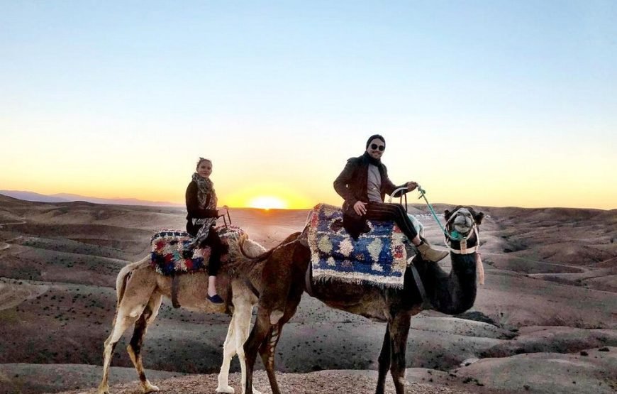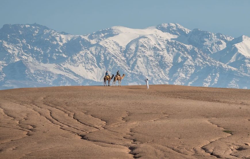 Your driver will meet you at your riad at 9 am to drive towards the Agafay desert, which is a 45-minute drive from Marrakesh. It’s a desert of stone, not sand, but it has a lot of appeals. You will have the impression of enormity with the Atlas Mountains in the distance, stunning landscapes. There are many options available to you on site: desert walk and camel ride At the end of the afternoon you will enjoy the sunset over the desert and then return to Marrakesh.