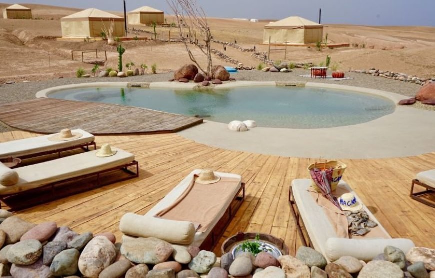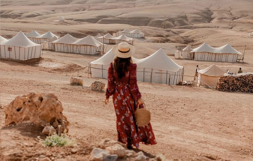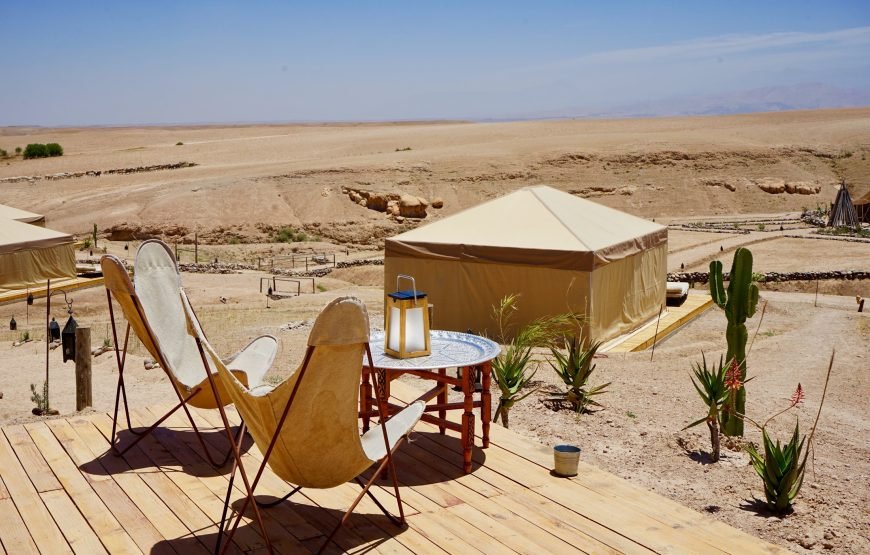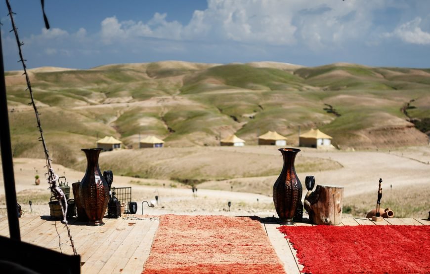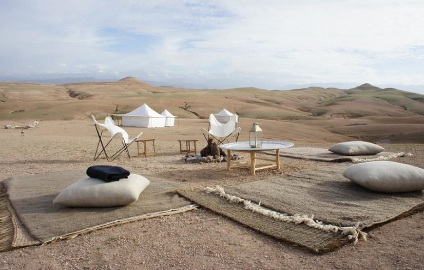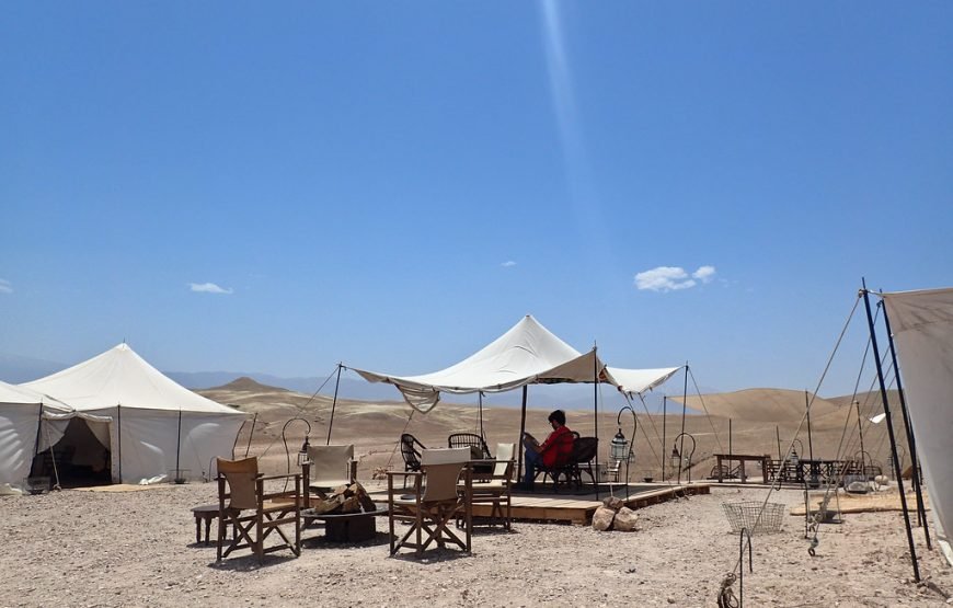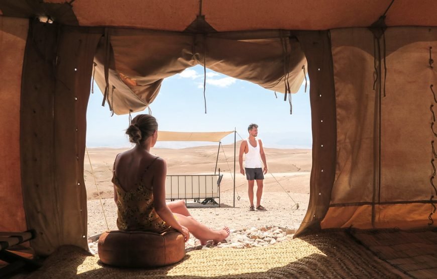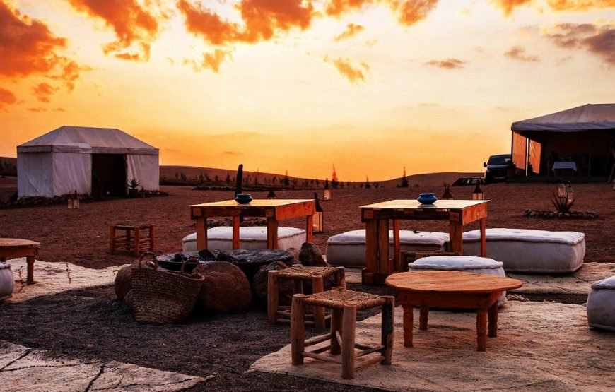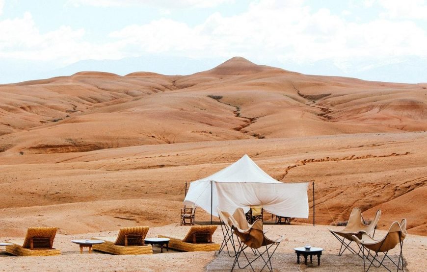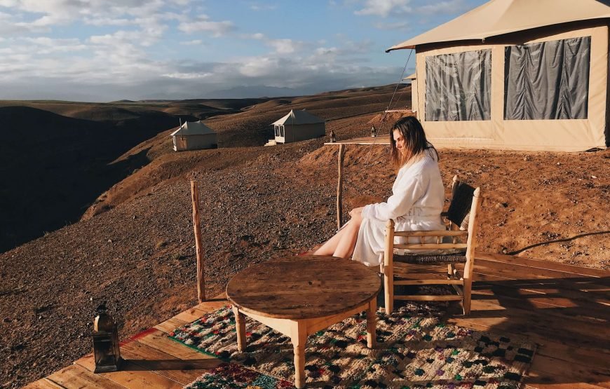 Your driver will meet you at your riad at 9 am to drive towards the Agafay desert, which is a 45-minute drive from Marrakesh. It’s a desert of stone, not sand, but it has a lot of appeals. You will have the impression of enormity with the Atlas Mountains in the distance, stunning landscapes. There are many options available to you on site: desert walk and camel ride At the end of the afternoon you will enjoy the sunset over the desert and then return to Marrakesh.